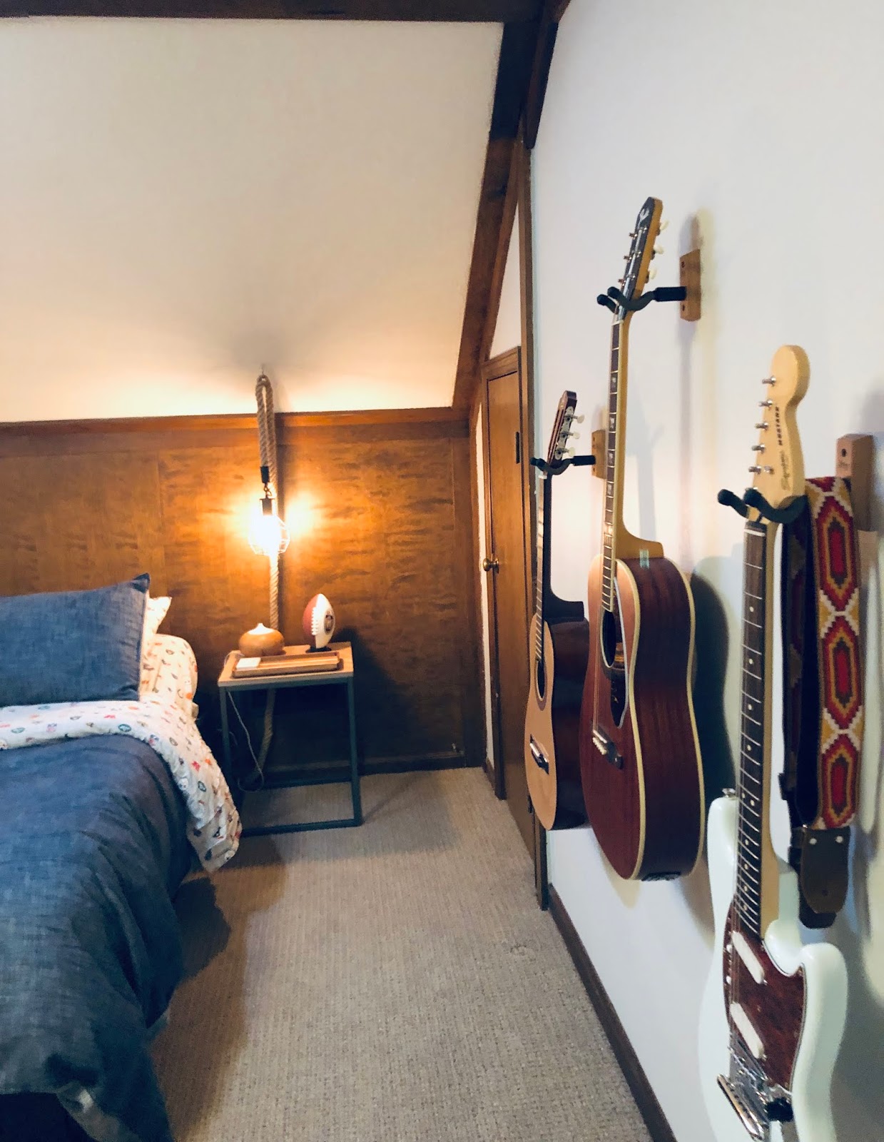 Zach is very musical so I wanted to not just give him a place for his guitars, but use them as art. These guitar mounts from Palmer Music were perfect and easy to install. We went with a warm gray on the walls.